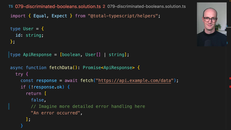 00:00 Okay, the key idea from this exercise is that discriminated unions the discriminator doesn't have to be a string. It can be a boolean and Here we can do basically we can turn this to Succeeded true and if it's true, then we will pass the users back or we will use false