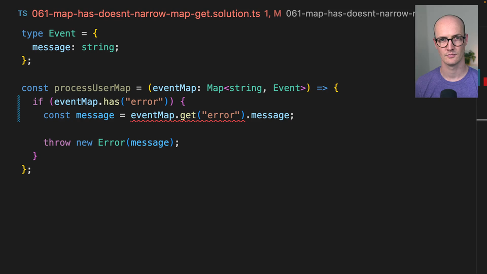 00:35 TypeScript doesn't know that that boolean is related to that map in any way, and so when it tries to do the .get here, it's just returning event or undefined. So the way that I would solve this is I would first of all just extract this to a constant, and so I would just call this event.