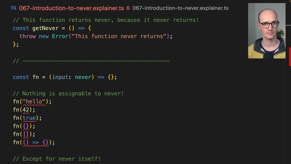 00:14 Well, never is the bottom type in TypeScript, never represents something that can never happen. And this means that let's say this function here, this function, like if we just had nothing happen inside this get never function,