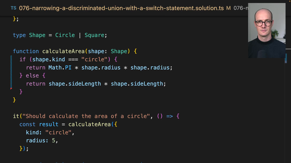 00:00 Okay, let's check out this CalculateArea function. We can remove all of this code. As soon as we remove it, all of our tests are going to break. But let's add a switch statement in here. And we're going to add shape.kind inside here. And now a couple of things happen. First of all, we get a case. And you notice, too, we're going to get autocomplete for caseCircle here.