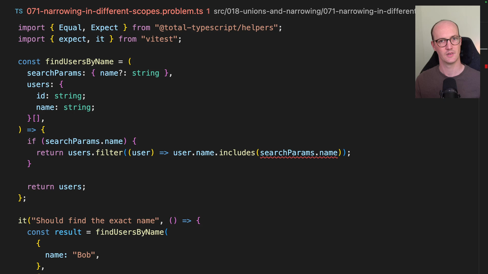 00:53 So actually, I can make this clearer by adding some curly braces and in return like this. Now, scopes have an impact on how TypeScript handles narrowing in certain cases.