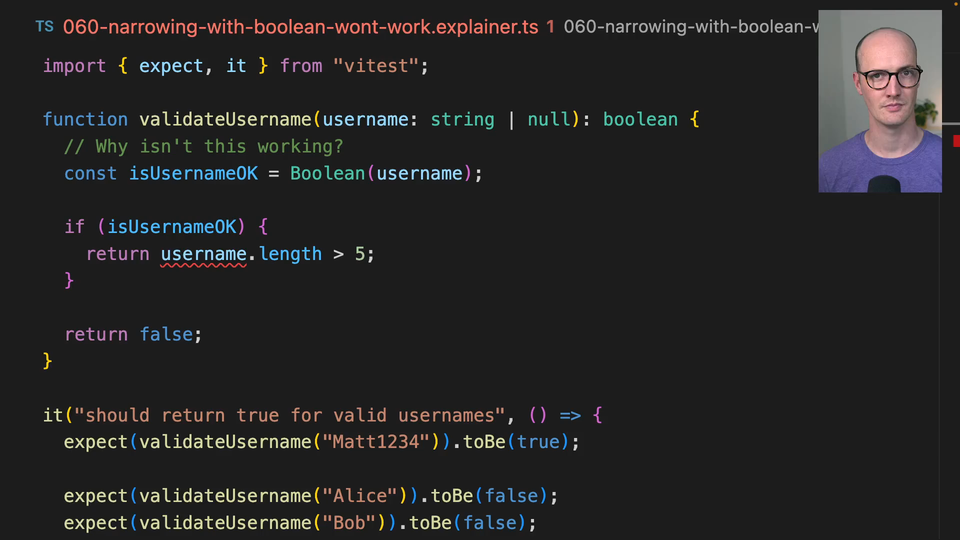 00:53 and doesn't understand that it's related to username. So while TypeScript's narrowing is extremely powerful, it does have little gotchas like this, which we will run into occasionally, and I'll point out as we go.