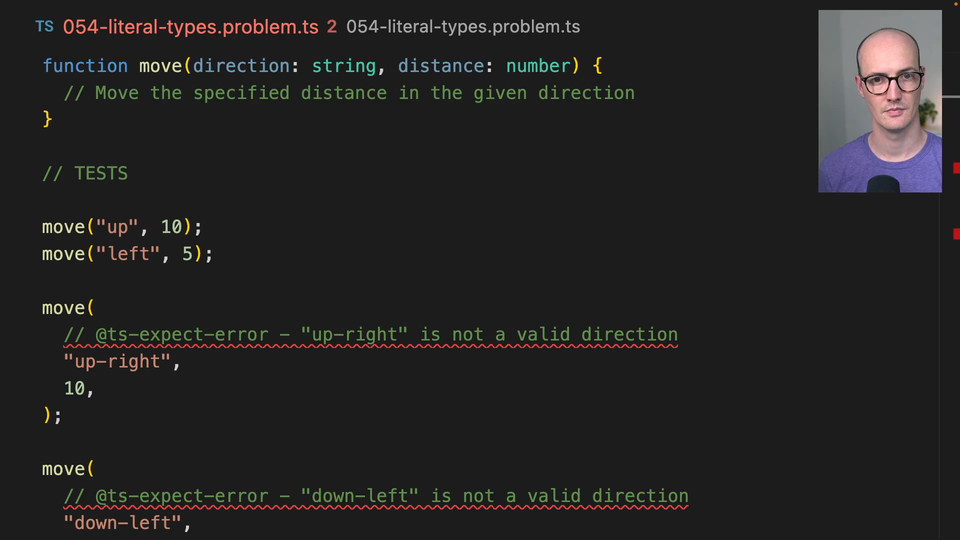 00:00 In this exercise, we have a move function that takes in a direction, which is typed as string and a distance, which is typed as number. The idea here is we could move up by 10 pixels or move left by 5 pixels, for instance. But we're actually expecting only a certain set of strings here.