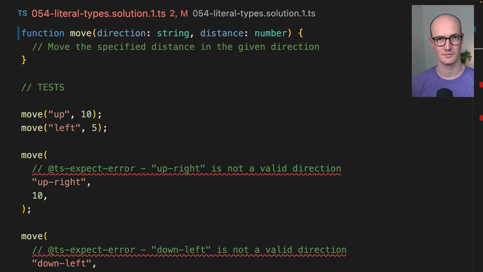 01:36 union types and unions of literals in a type and use it later. And we can also do this, also just have it in line. That's perfectly fine too. It doesn't make too much difference. But this is a really nice introduction to literal types. So literal values in TypeScript