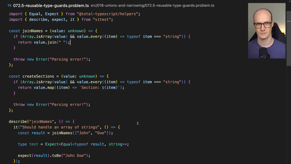 00:00 Let's imagine that we have 2 functions that do very, very similar things. We have join names here, which takes in a value which is unknown. This could be a value coming from anywhere, coming from search params, coming from user inputs. And it checks to see if it's an array, first of all, then it checks to see if every single item is a string