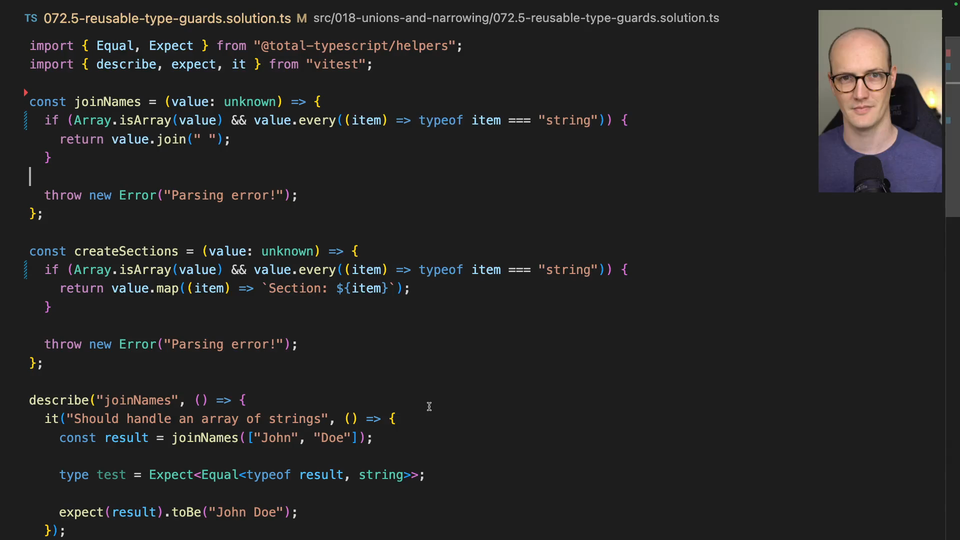 00:52 In fact, I'll zoom in a touch. And we have a return type here, which looks very interesting. We have valueUnknown as the parameter, and the return type is valueIsStringArray. This is what's called a type predicate. And type predicates are something which are quite advanced in TypeScript. We will look at them, I think, probably in maybe the
