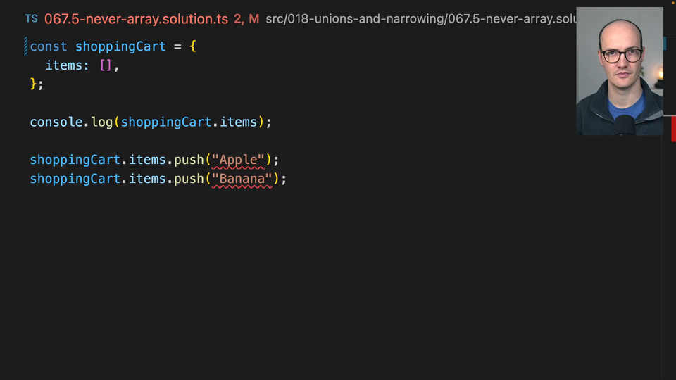 00:38 but it's never containing anything. This is the type that TypeScript gives it. So this is a little awkward. It means that when we then push to that items thing here, it means that sure, we can't push string, we can't push number, can't push anything to it because nothing is assignable to never. So how do we, of course, if we did this,